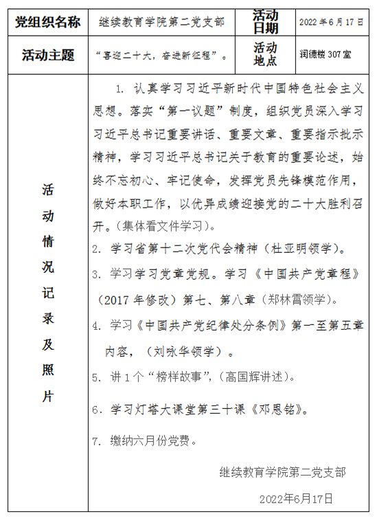 万象城娱乐awc线路第二党支部党员学习活动纪实表20220617