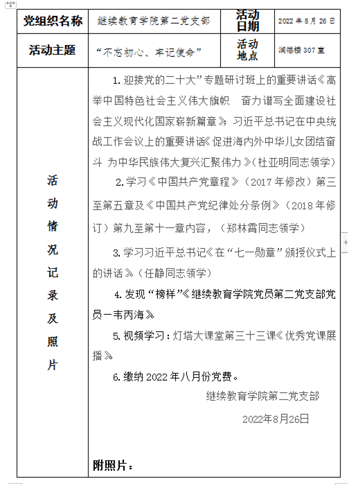 万象城娱乐awc线路第二党支部党员学习活动纪实表20220826