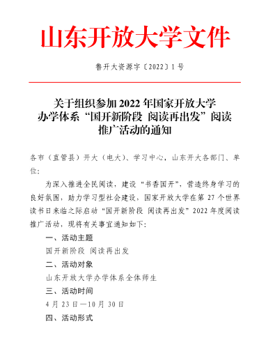 关于参加2022年国家开放大学办学体系+“国开新阶段+阅读再出发”阅读推广活动的通知